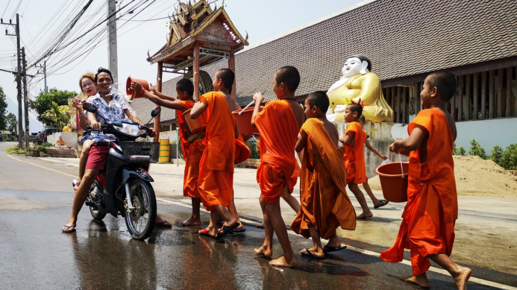 As Theravada Buddhism flourished in Thailand, the Hindu festival of Songkran took on new dimensions. One of the revered traditions is merit-making, with people offering food to monks and visiting temples to pray. This is also believed to ward off bad luck from the previous year and bring good luck for the new year.