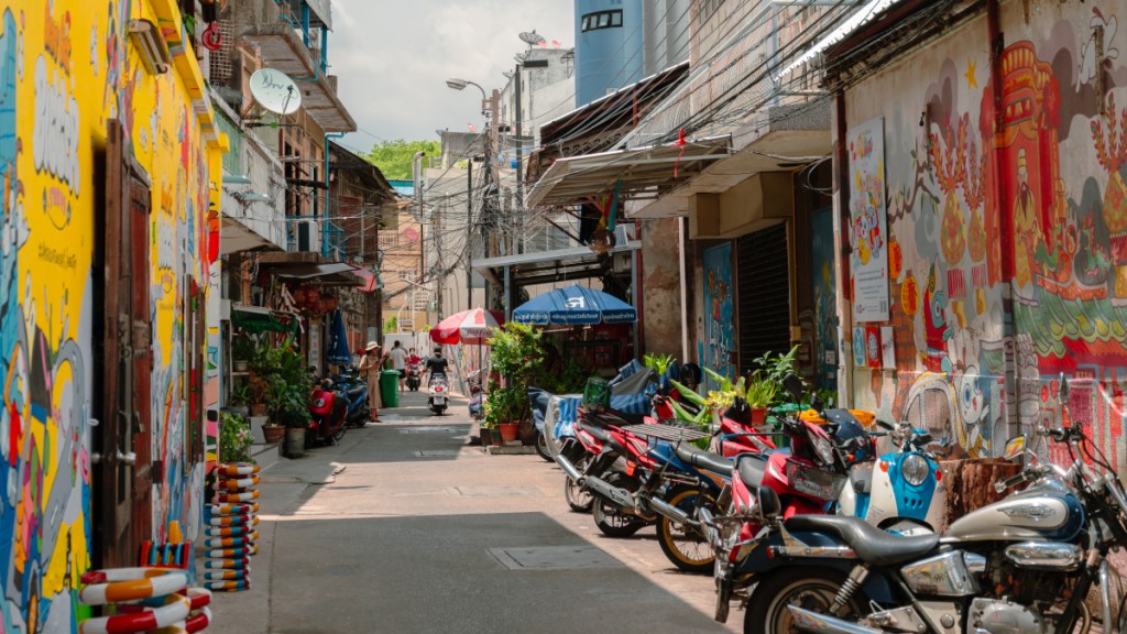 Next is Talat Noi. The district’s name means “The Small Market,” and it is a place where you cannot help but film every detail. We follow the Talat Noi Street Art, an alley of murals and photos, and pay a visit to the Rong Kueak Chinese Shrine before stopping by the Fiat-500 Antique Turtle Car, an old abandoned car turned into a world-renowned landmark.