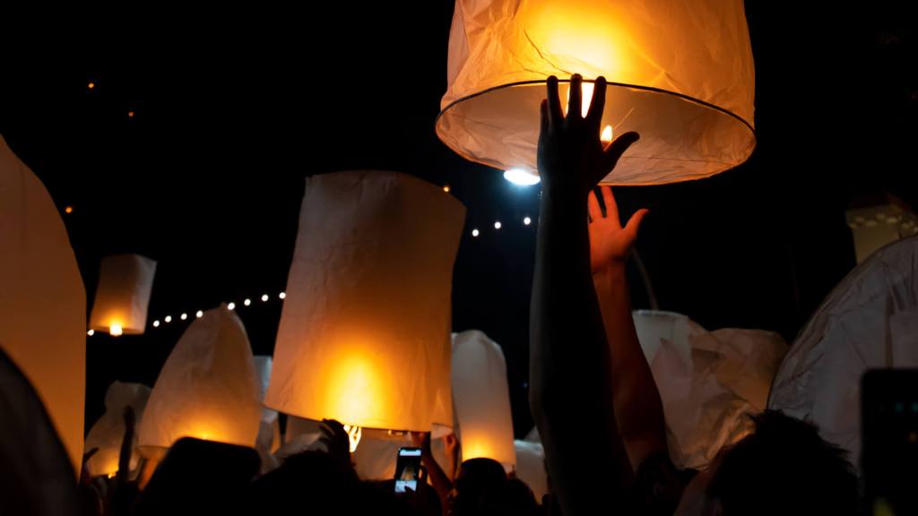 The island is illuminated by thousands of sky lanterns floating heavenward, symbolizing the sins and bad luck of the past year drifting away. Fireworks illuminate the night sky, climaxing at midnight.
