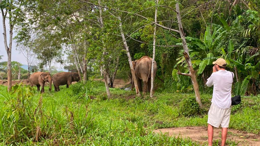 Mr. Cam guides us through the vast central Phuket territory his project occupies, which was honored as Elephant Sanctuary of the Year 2023. While we walk, he explains that an elephant’s day usually begins with a bath and breakfast, which then blends into lunch, dinner, and that familiar late-night snack.