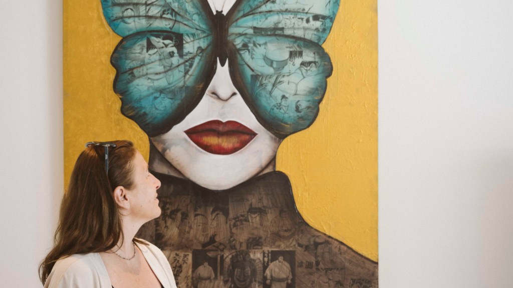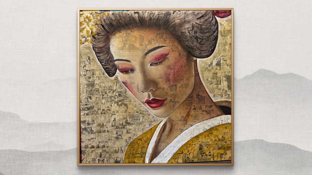 Expanding her creative horizons while staying true to her signature approach, Celine continues to paint female portraits on canvases layered with original vintage Japanese manga pages.